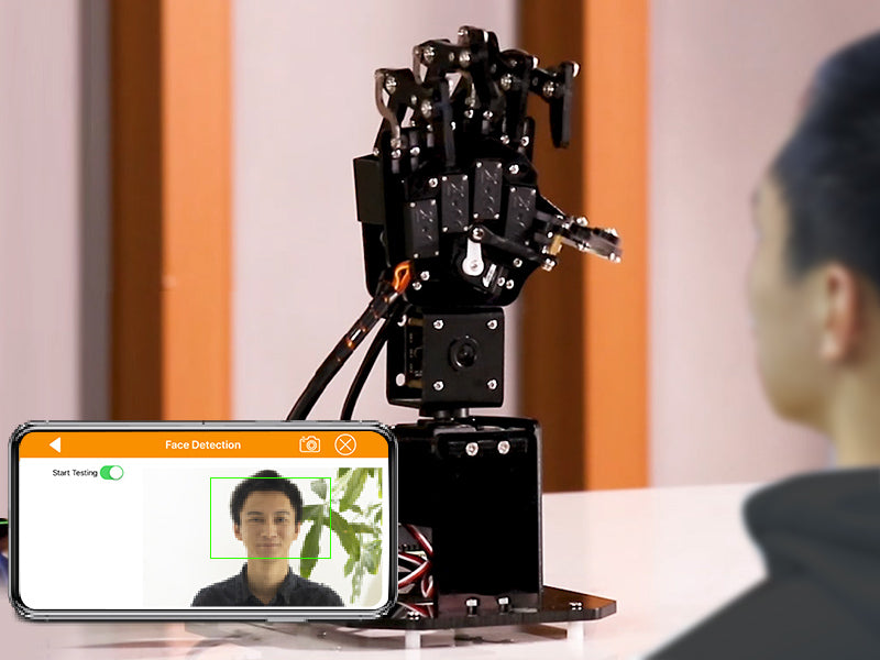 Powered by Raspberry Pi 4B, uHandPi is an AI smart vision robotic hand. Loaded with HD camera, it can realize color recognition, face detection and other functions through OpenCV. Apart from image processing, uHandPi can carry out machine learning, and train various models with the help of Tensorflow+Keras. For better using experience, uHandPi is equipped with mobile APP!
