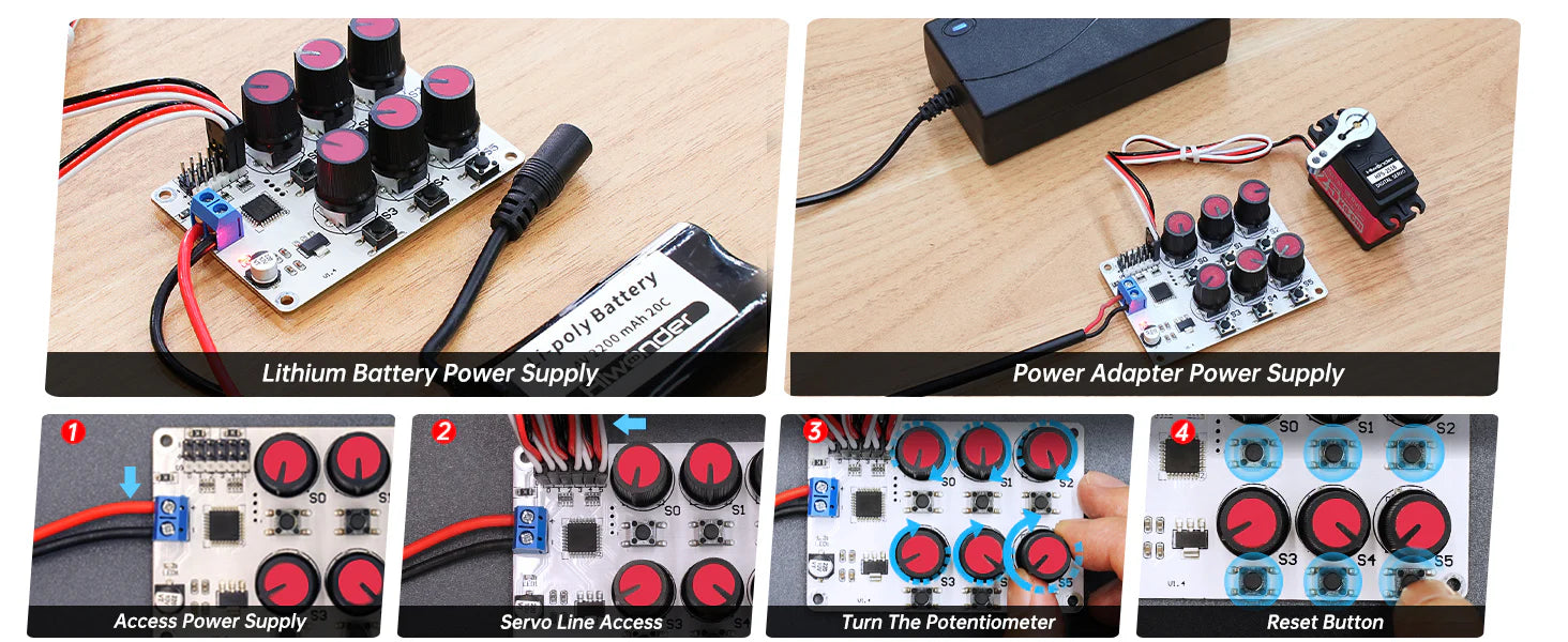 Manual Adjustment - The controller has 6-channel PWM digital servo port, adopts high-accuracy potentiometer for precise servo control and provides servo reset function.