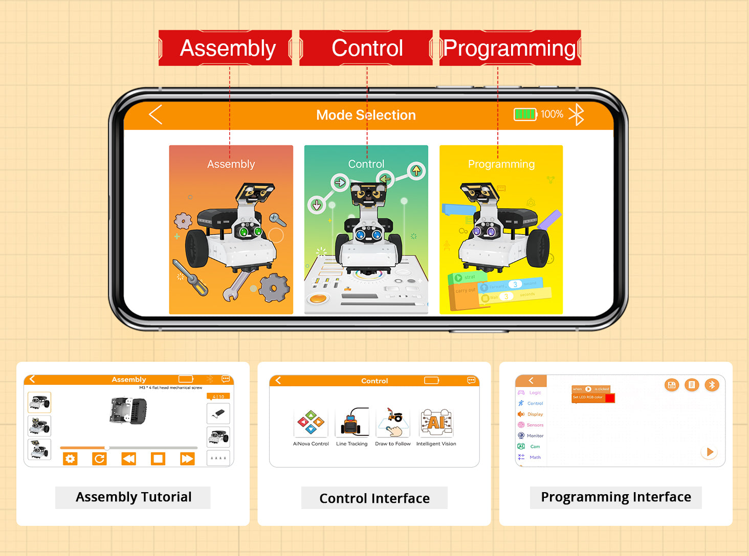 AiNova supports Android and IOS dual system mobile phone APP remote control. Through the APP, we can learn how to assemble robots, realize body remote control, and experience a variety of AI intelligent gameplay. We can also program robots and quickly experience the fun of programming.