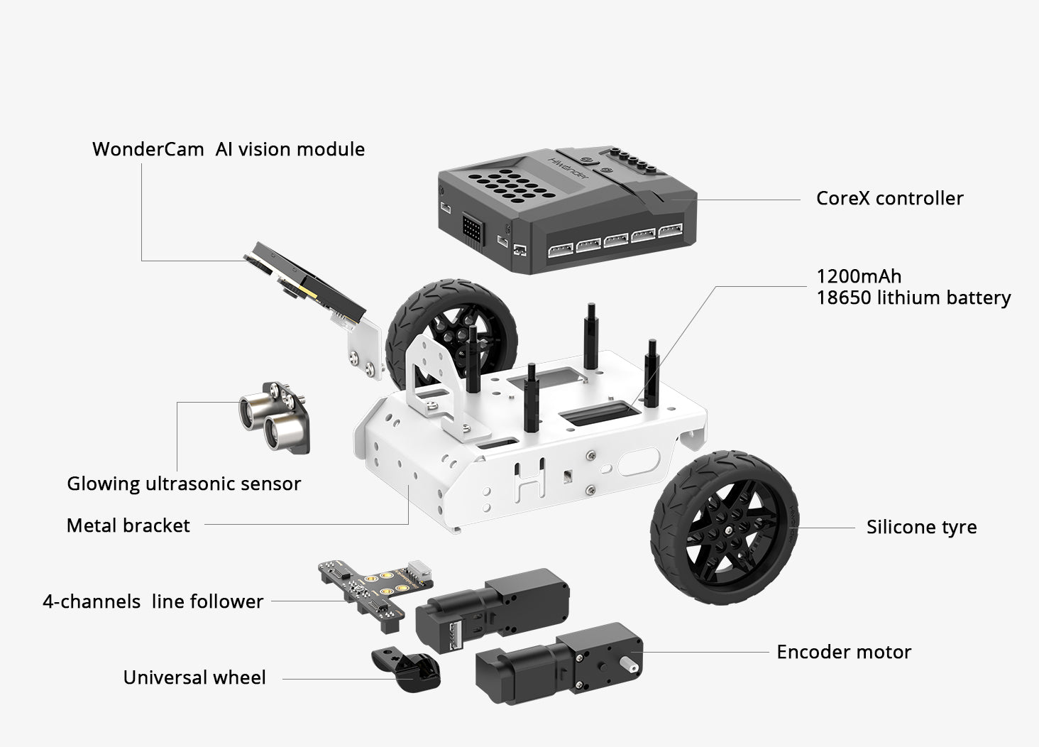 AiNova is a next-generation AI technology education robot based on graphical and Python program. Loading with CoreX controller, encoder motors, 4-channel line follower and glowing ultrasonic sensor, it can perform line follow, obstacle avoidance, etc. The standard version integrated with WonderCam vision module is available for AI games such as Autonomous Driving, Vision Line Follow, Tag Tracking, etc.