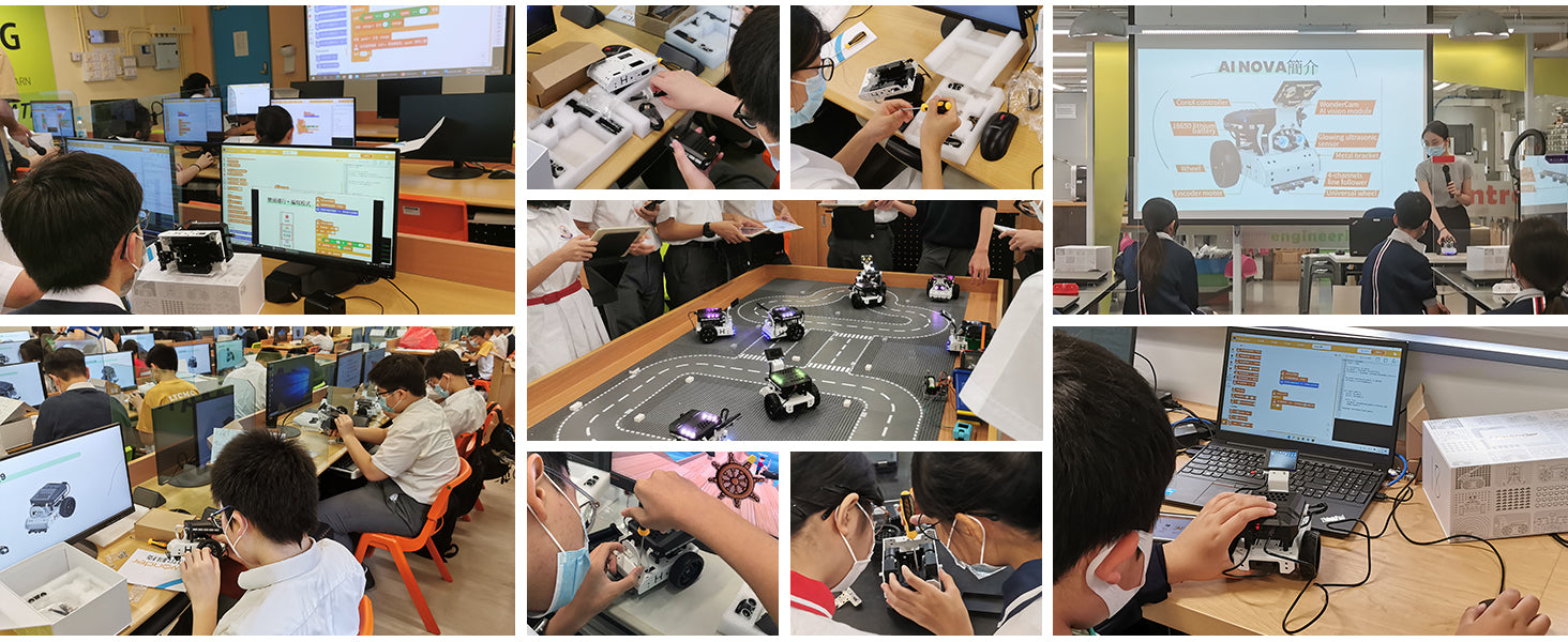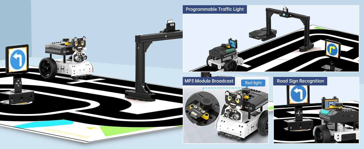 The AiNova vision car can simulate AI smart traffic scenarios. Through Scratch graphical programming, AiNova can perform traffic light recognition and road sign recognition, and perform voice broadcast through the MP3 module, easily realizing AI driverless gameplay.