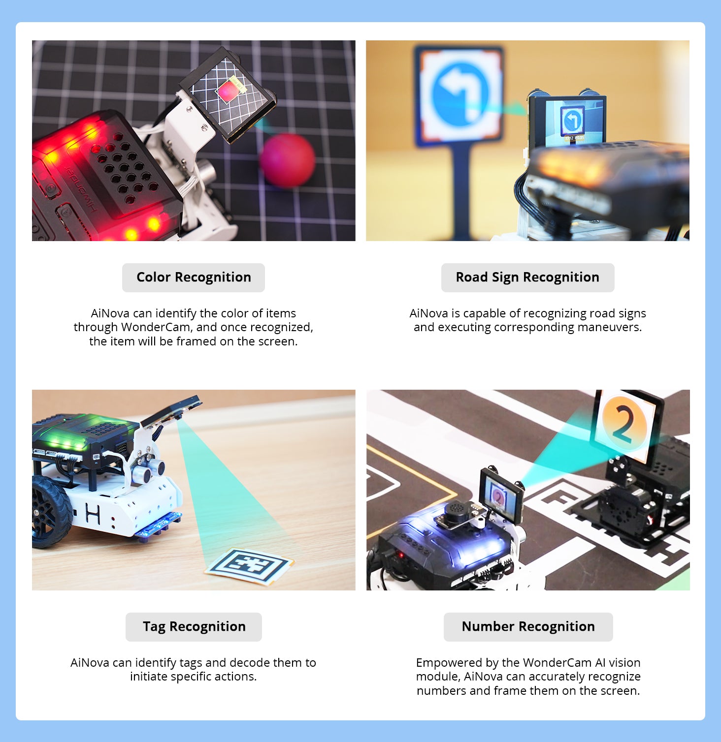 AiNova is equipped with the WonderCam Al vision module that supports image recognition. User can program AiNova to implement a variety of games such as color recognition, number recognition, road sign recognition, tag recognition, etc.