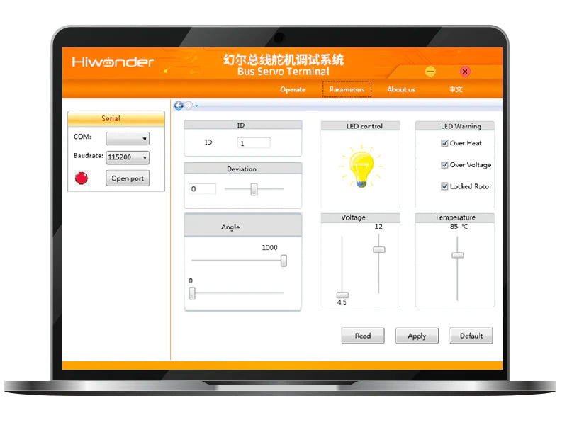 In Debugging system, you can set ID number, working mode, rotation speed, position deviation, LED light, temperature alarm and voltage alarm for servos.