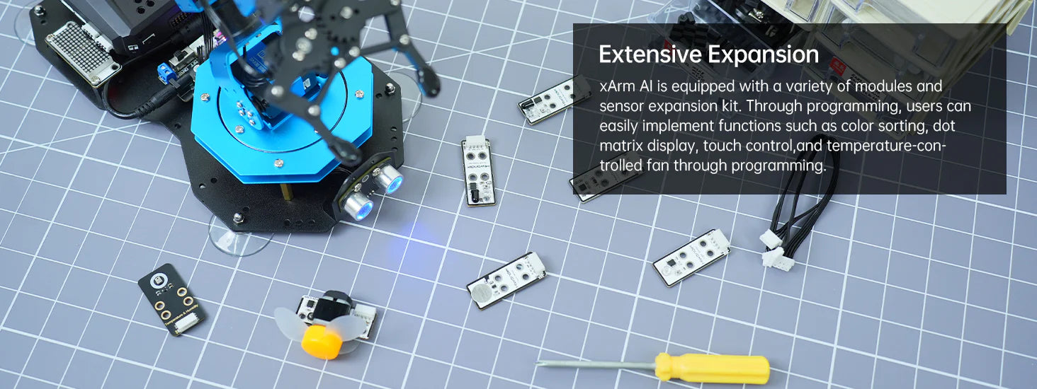 Powered by the CoreX multifunctional controller, the xArm AI supports servos, motors, and a wide range of sensors, ensuring full compatibility with the Hiwonder sensor lineup. It offers Arduino, Scratch, and Python programming options, along with interactive courses and video tutorials—making it easy for users to learn AI and programming while exploring endless creative possibilities.