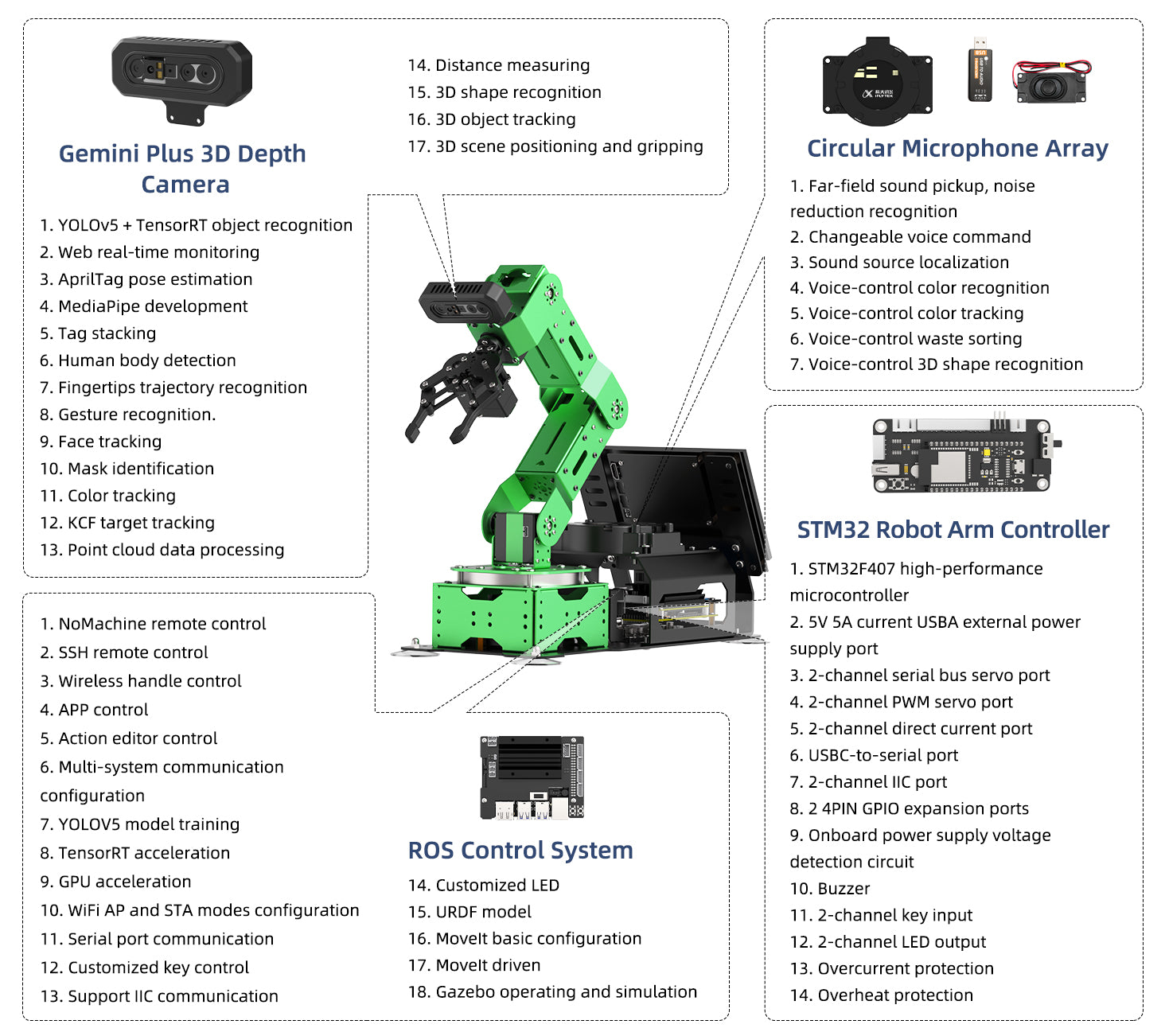 JetArm Ultimate Kit is equipped with a circular 6-microphone array. Going beyond the one-way command-response pattern of traditional AI models, JetArm—powered by ChatGPT—enables a cognitive leap from semantic understanding to physical execution, significantly enhancing the naturalness and fluidity of human-machine interaction. Combined with advanced machine vision, JetArm delivers outstanding capabilities in perception, reasoning, and action, making it ideal for developing sophisticated embodied AI applications.