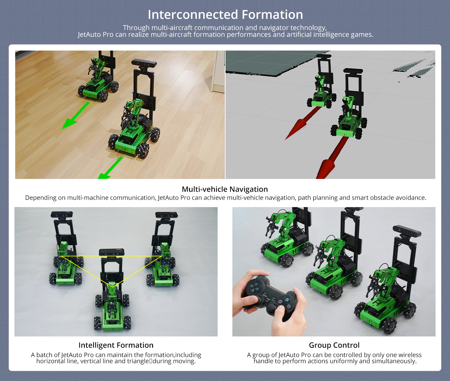![]() 360° Omnidirectional MovementWith 4 omnidirectional mecanum wheels, JetAuto Pro can move 360°. Different movement modes (move forward, horizontally, diagonally and rotate ) and excellent performance make it bold to challenge various complicated routes. |