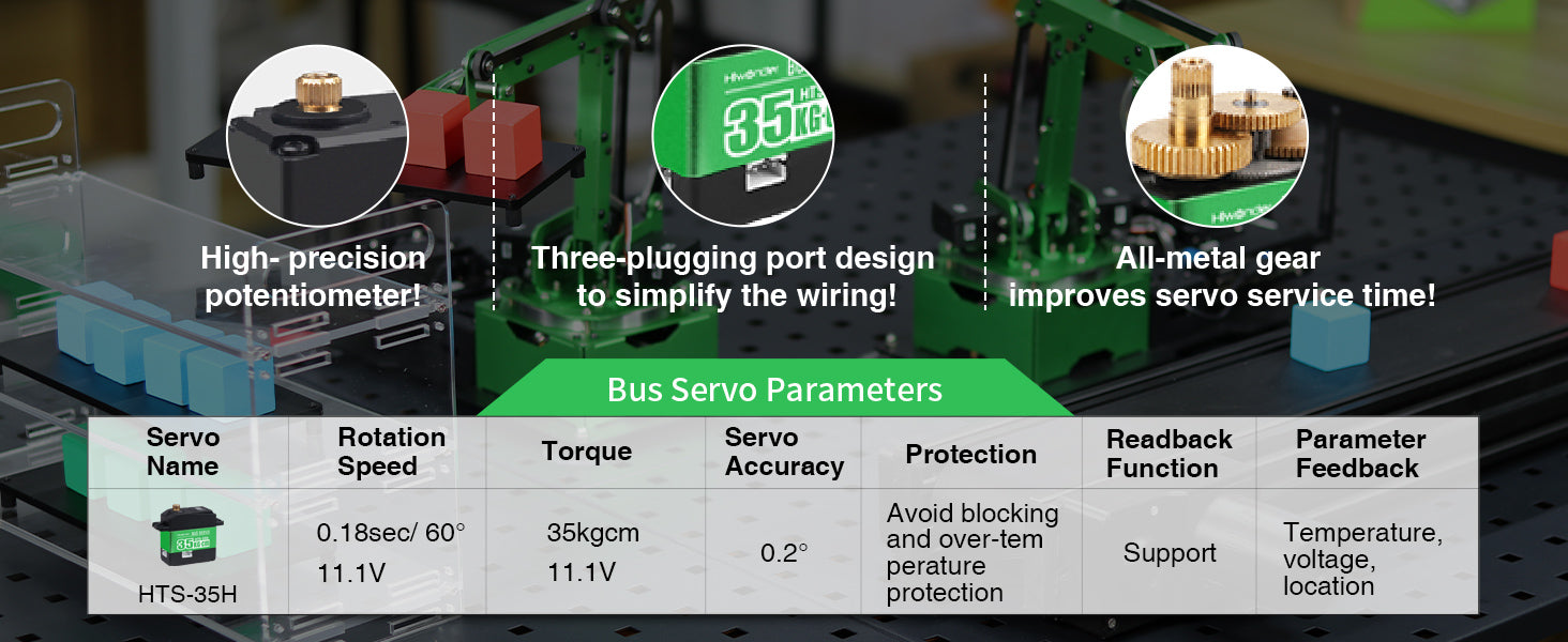 This three connectors serial bus smart servo possess 35KG torque and adopts all-metal gears inside, strong and durable. It can be controlled by serial port commands, connected to multiple servos at the same time, which can help us create robotic arms and bionic robots. Compared with ordinary servos on the market, it can read back the angle and faceback voltage, temperature position parameter.