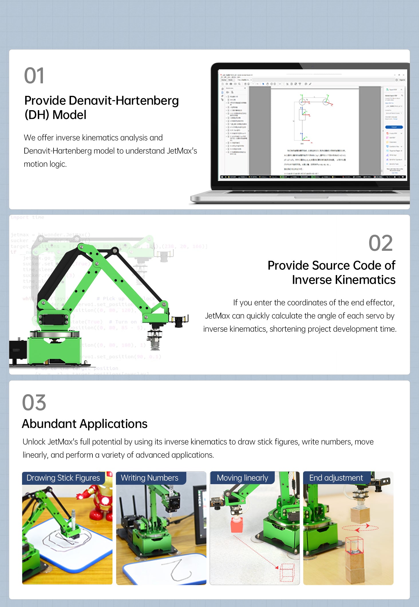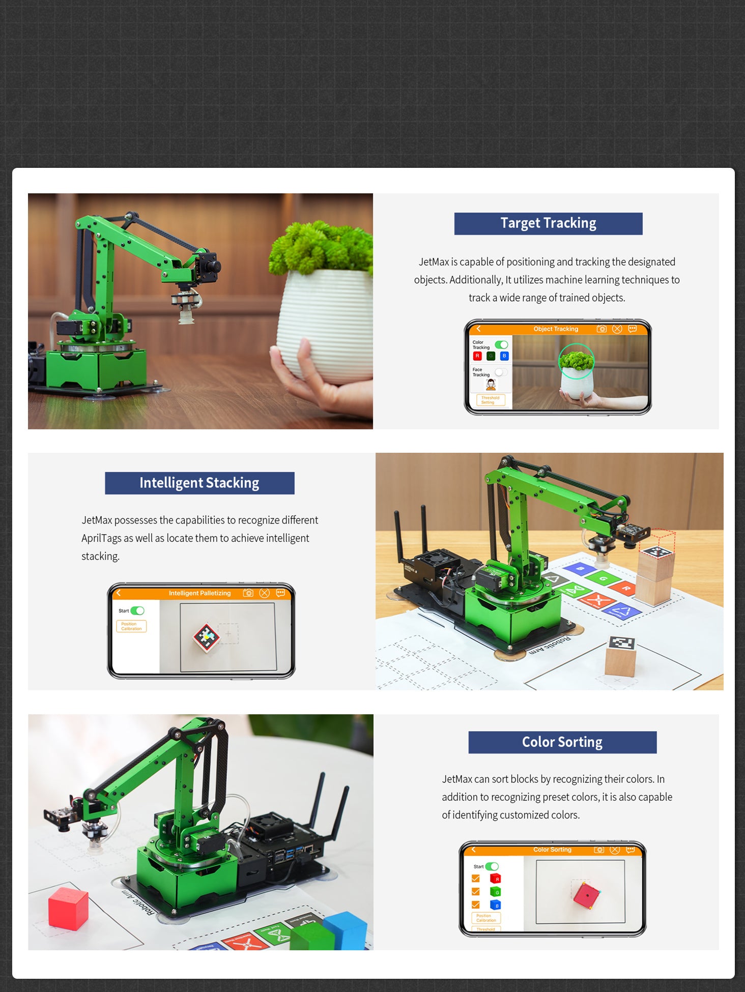 ![]() Creative ExpansionWorking with a electrical sliding rail, JetMax excels in transporting, sorting, and stacking through precise motion distance calculations. |