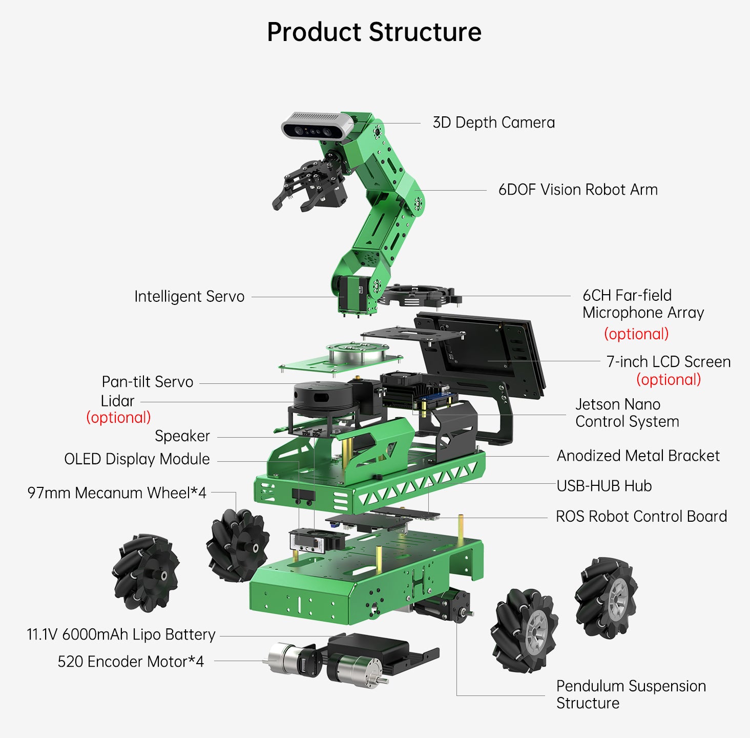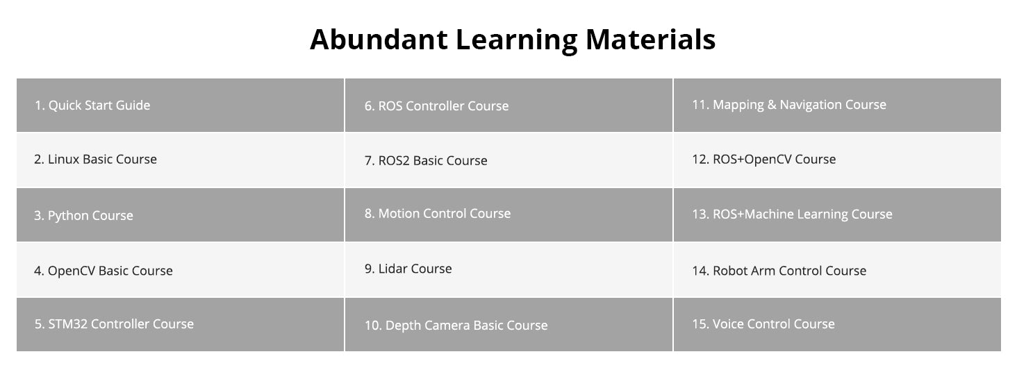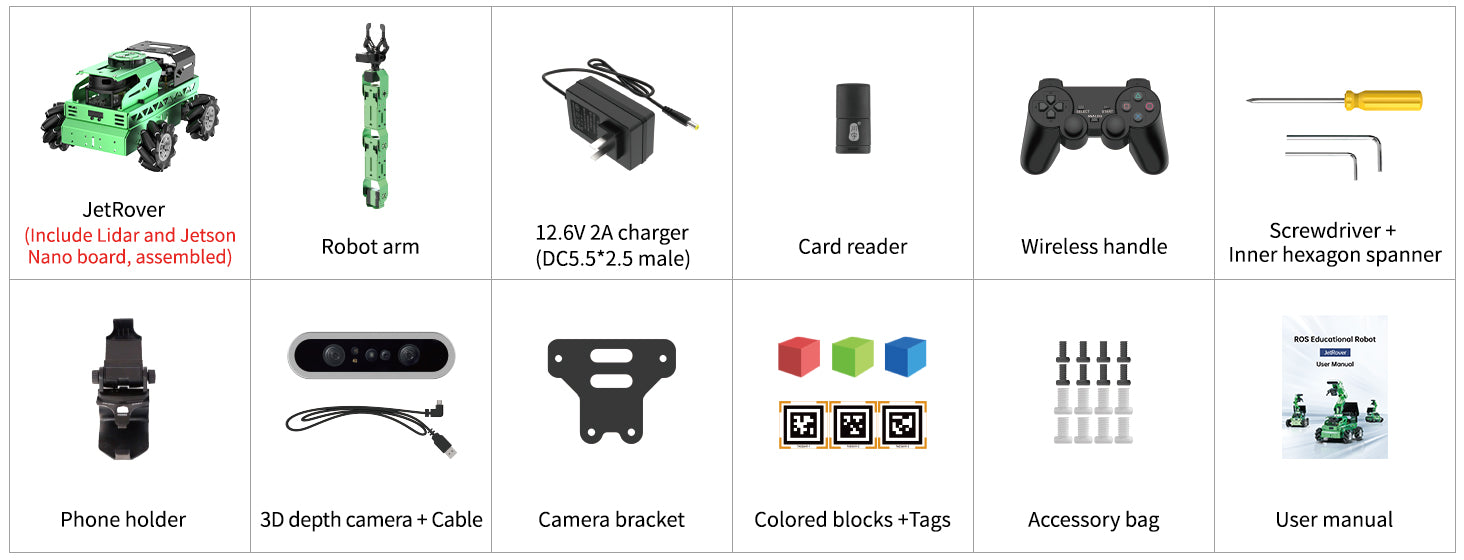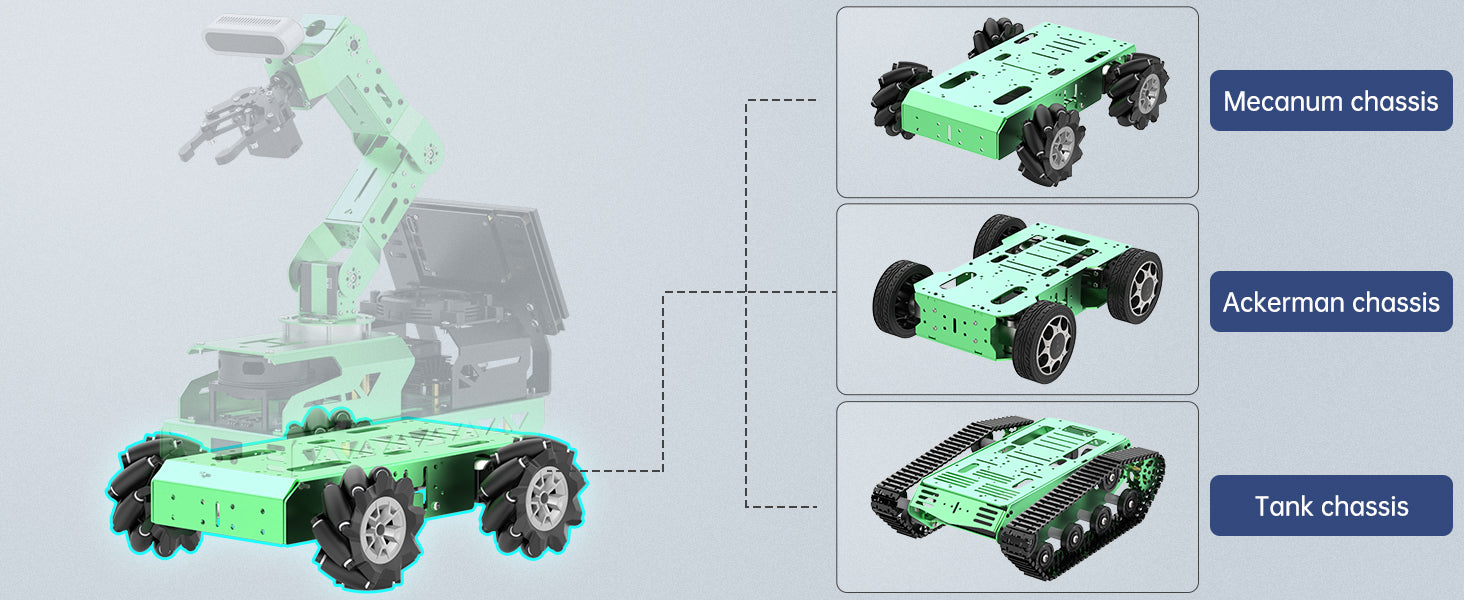 Notice:The packing list takes the mecanum wheel chassis as an example. Users can choose Ackerman or tank chassis. All other accessories are the same except for the chassis.