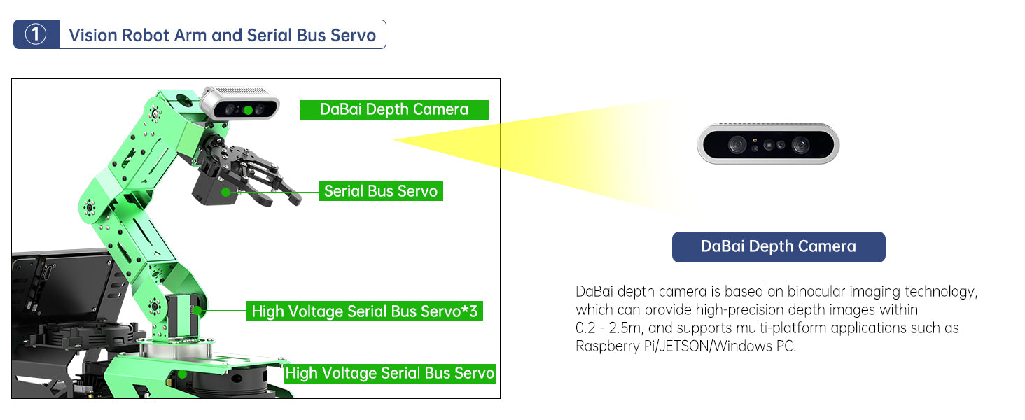 ![]() Depth Vision First-Person ViewJetRover is equipped with a 6-degree-of-freedom robotic arm, equipped with a high-performance 3D depth camera at the end, which can realize target recognition, tracking and grabbing. |