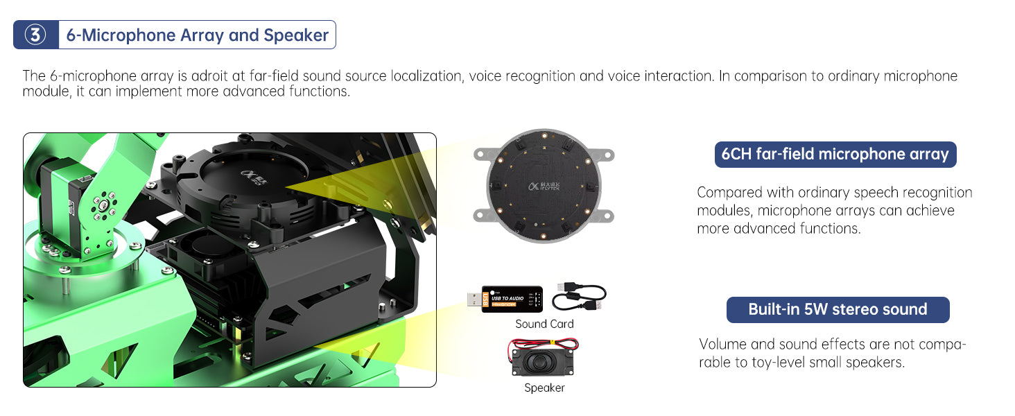 ![]() 6CH Far-field Microphone ArrayThe 6CH Far-field Microphone Array and speakers support sound source positioning, voice recognition control, voice navigation and other functions. |