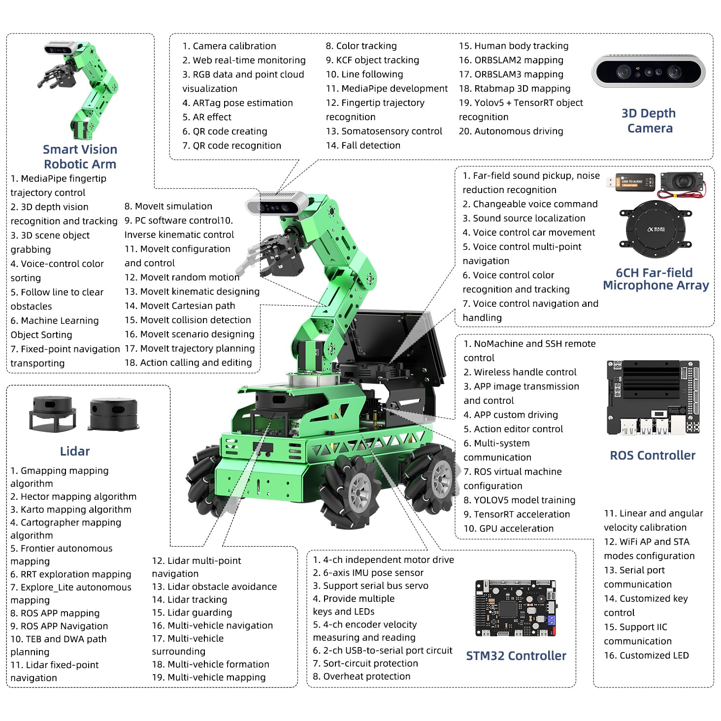 JetRover is a composite ROS robot developed by Hiwonder for ROS education scenarios. It supports three motion chassis: Mecanum wheel, Ackerman steering, and crawler. It is equipped with NVIDIA Jetson Nano, high-performance magnetic encoding motor, and 6-degree-of-freedom robotic arm. High-performance hardware configurations such as lidar, 3D depth camera, 7-inch LCD screen, and far-field microphone array can realize robot motion control, mapping navigation, path planning, tracking and obstacle avoidance, autonomous driving, 3D grabbing, navigation and handling, and somatosensory Interaction, far-field voice interaction, group control formation and other applications.