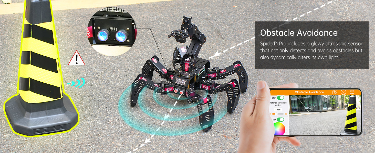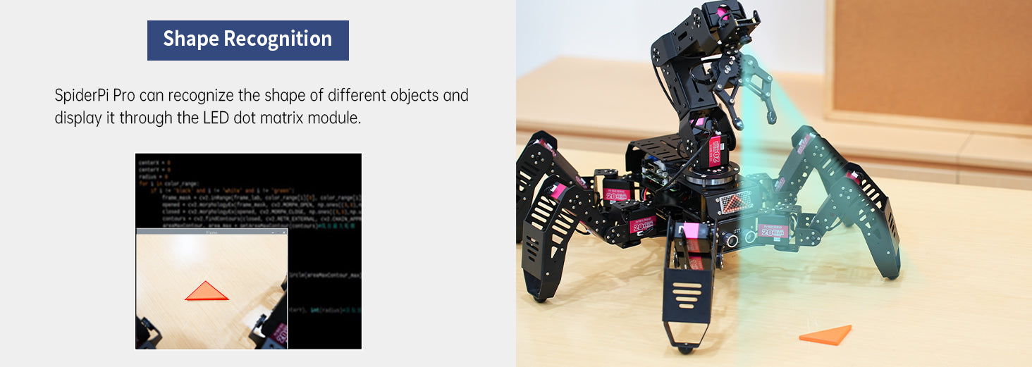 SpiderPi Pro is an advanced hexapod robot integrated with AI vision and powered by Raspberry Pi. It features intelligent serial bus servos with a torque of 20KG, 5DOF robot arm, glowy ultrasonic sensor, IMU sensor and dot matrix module and can be programmed using Python. SpiderPi Pro serves as an ideal platform for conducting research in motion control for hexapod robots, machine vision, OpenCV, deep learning, and various other fields.