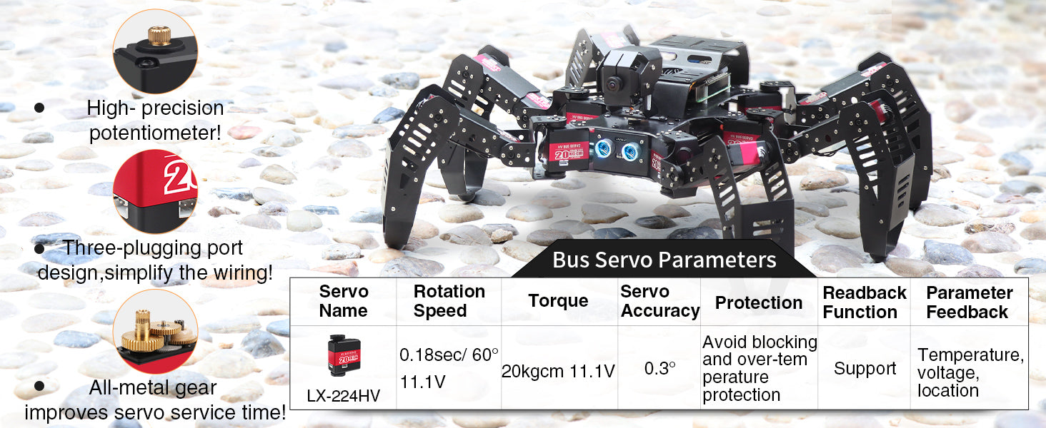 The controller of SpiderPi is Raspberry Pi 4B and the programming language is Python. Equipped with 2DOF HD camera, SpiderPi can realize intelligent games such Facial Recognition and Intelligent Transport.