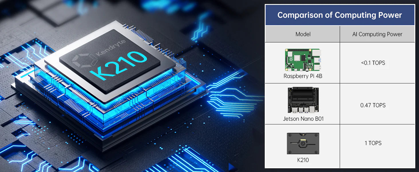 Kendryte K210 is a system-on-chip that integrates machine vision and machine hearing capabilities. It uses TSMC's ultra-low-power 28nm advanced process, has a dual-core 64-bit processor, has a total computing power of up to 1TOPS, has a variety of built-in hardware acceleration units (KPU, FPU, FFT, etc.), and has good power consumption performance. Stability and reliability.