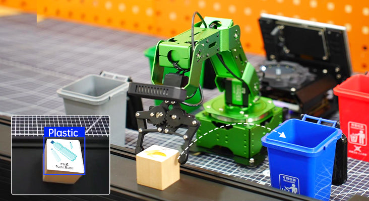 Waste SortingJetArm's kit is equipped with garbage pattern blocks. By loading the corresponding model, JetArm can quickly recognize different garbage and place it in the corresponding classification area. |