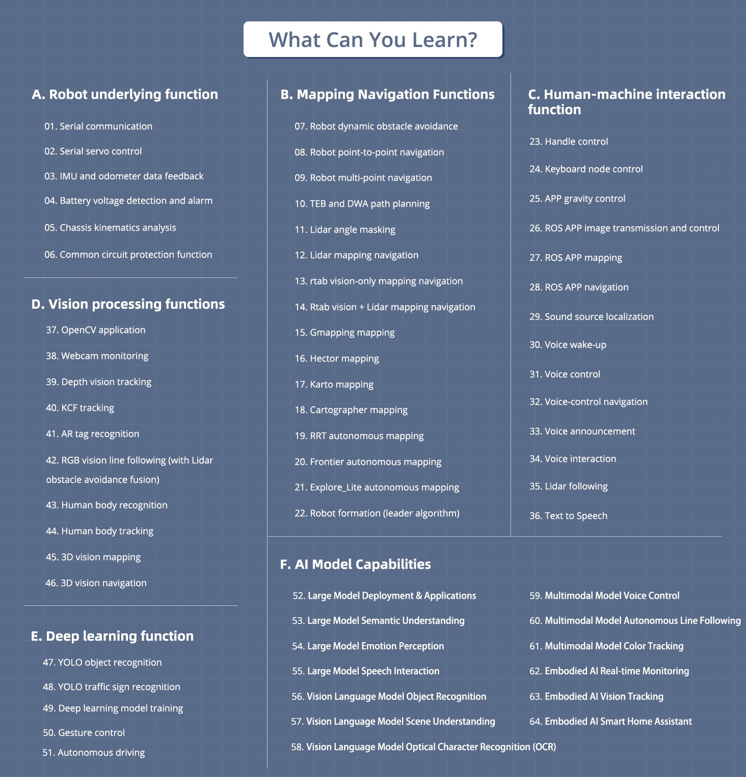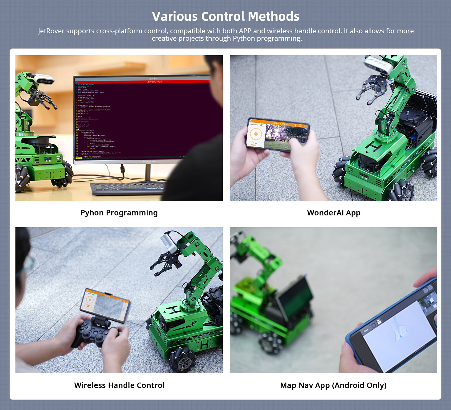 JetRover is a composite ROS robot developed by Hiwonder for ROS education scenarios. It supports three motion chassis: Mecanum wheel, Ackerman steering, and crawler. It is equipped with NVIDIA Jetson Nano, high-performance magnetic encoding motor, and 6-degree-of-freedom robotic arm. High-performance hardware configurations such as lidar, 3D depth camera, 7-inch LCD screen, and far-field microphone array can realize robot motion control, mapping navigation, path planning, tracking and obstacle avoidance, autonomous driving, 3D grabbing, navigation and handling, and somatosensory Interaction, far-field voice interaction, group control formation and other applications.