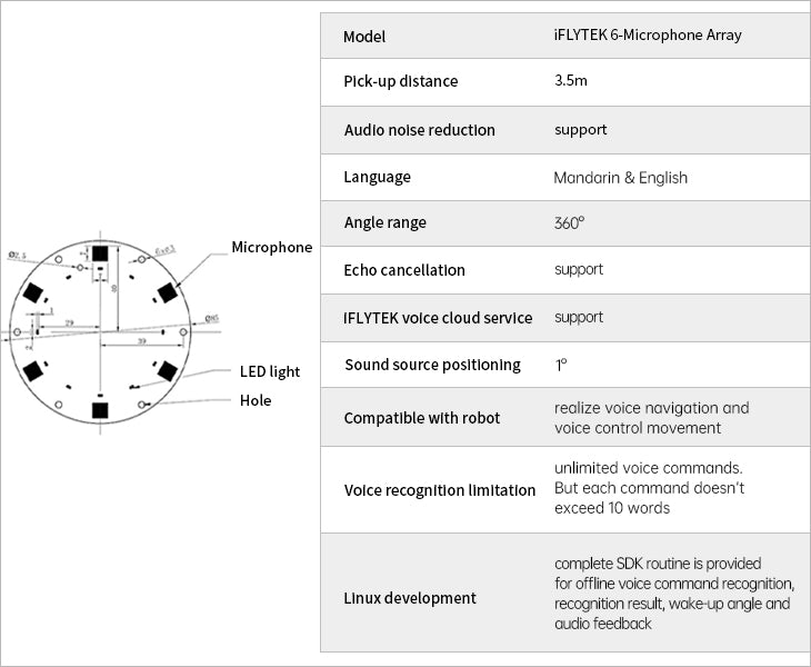 6CH Far-field Microphone ArrayThe 6CH Far-field Microphone Array and speakers support sound source positioning, voice recognition control, voice navigation and other functions. |