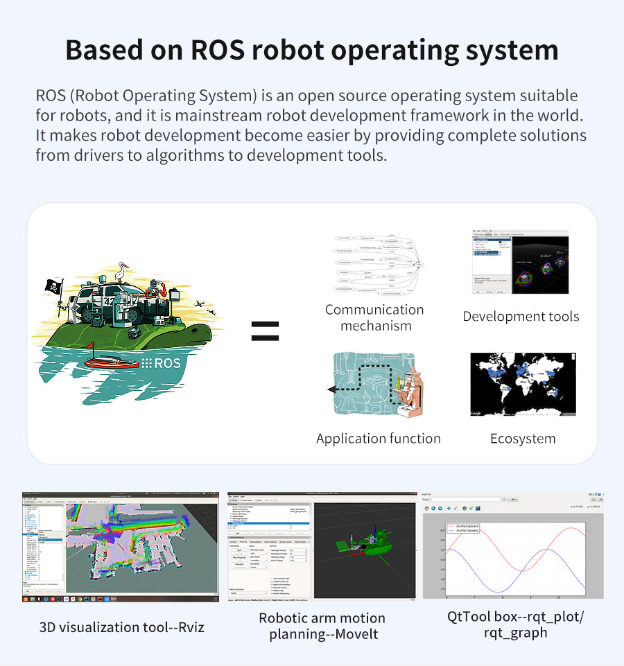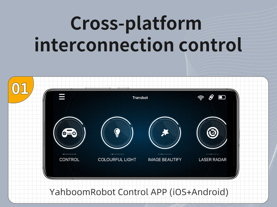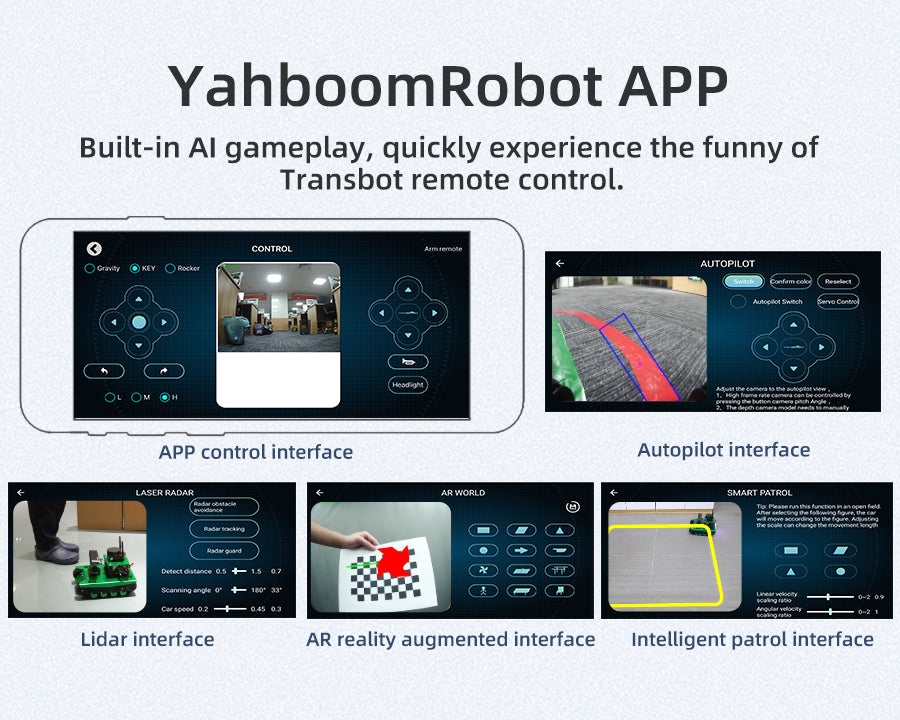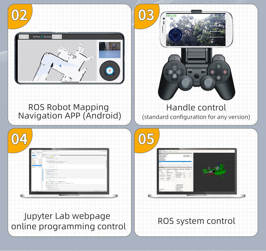 - Cross-platform interconnection control: Mobile remote control APP integrated with a variety of AI functions; handle control that can experience the FPV real-time visual effects; JupyterLab online programming and robot operating system control.