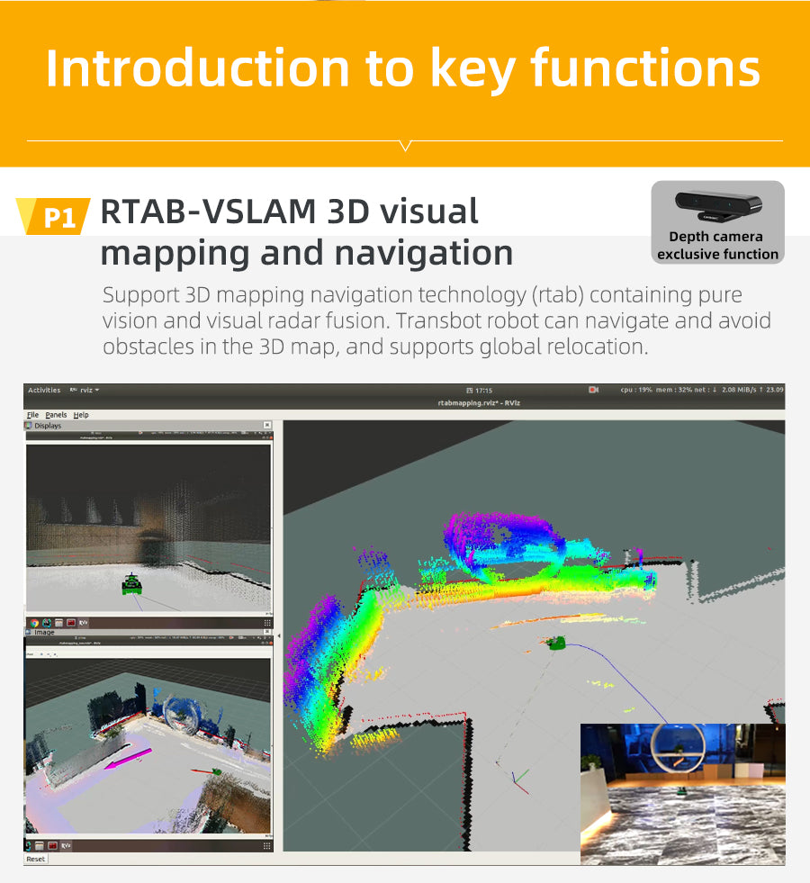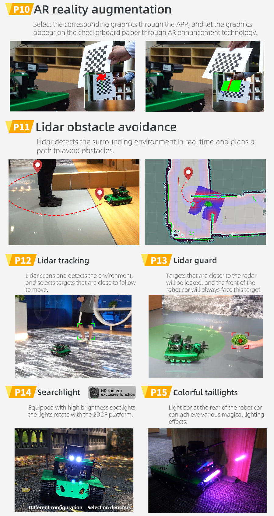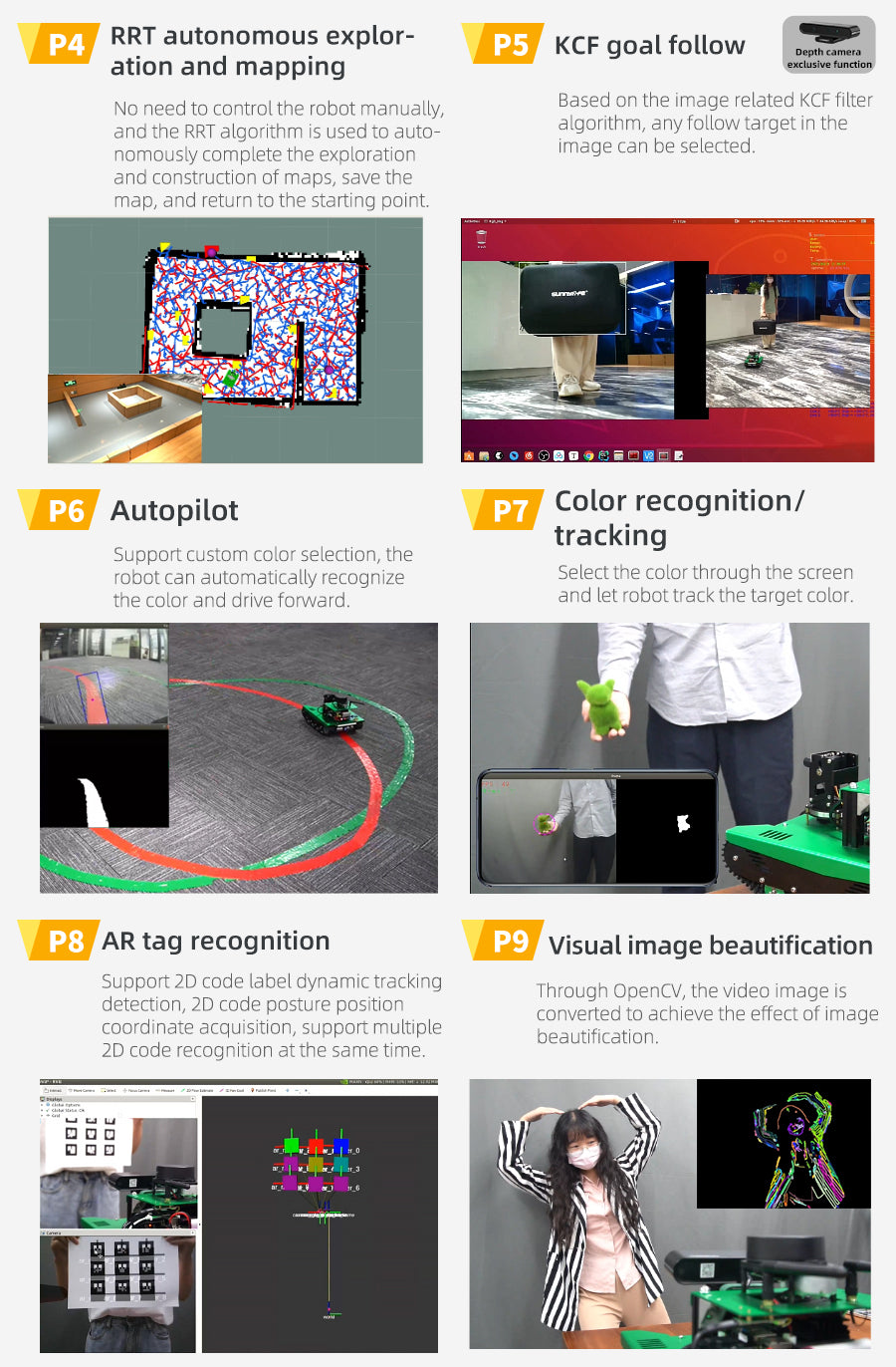 - Wonderful AI functions: Lidar avoiding, fixed-point navigation, bone detection, finger following, camera calibration, 3D visual mapping navigation, etc.