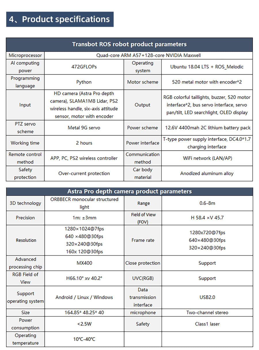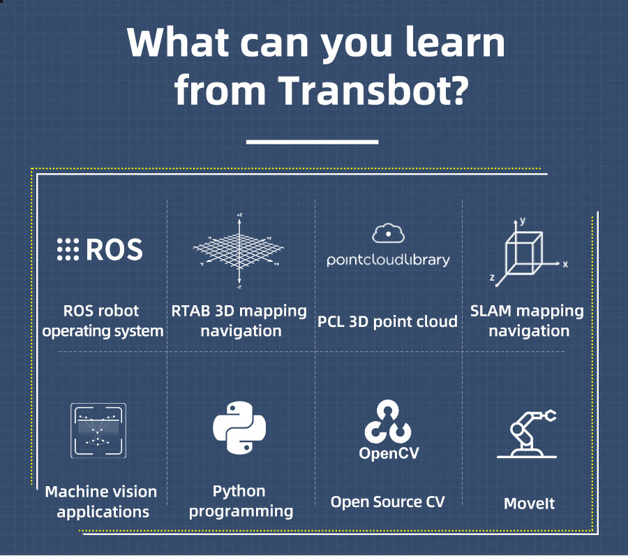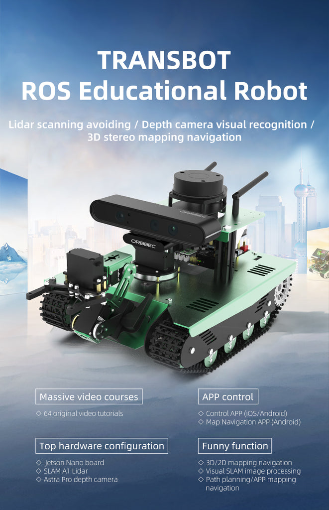 Transbot is a crawler off-road robot based on ROS(robot operating system) and Python programming, which is designed for ROS enthusiasts and robot players. It is equipped with high-performance hardware configurations such as Jetson NANO, Lidar, HD camera/depth camera, etc., which can realize applications such as robot motion control, remote communication, mapping navigation, following-avoiding, autopilot and robotic arm MoveIt simulation. A lot of teaching course documents and videos to help you get started with ROS easily.