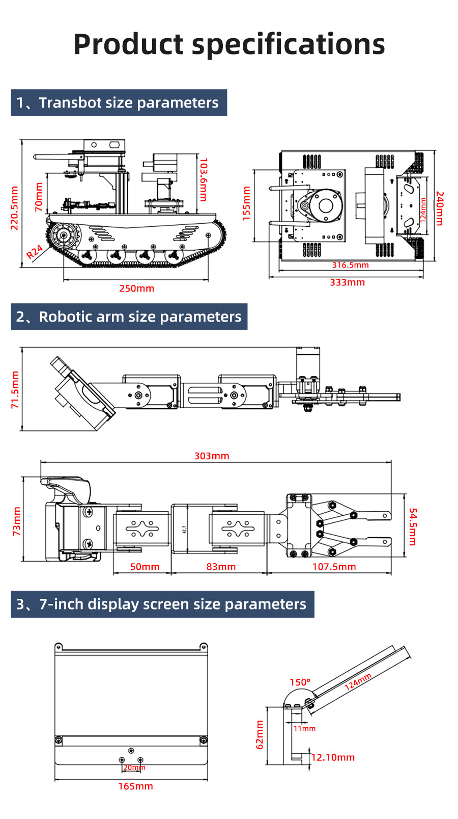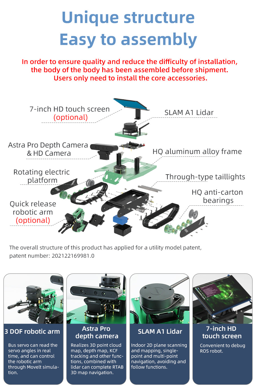 - Crawler style, support for quick assembly robotic arm: The whole car is made of green aluminum alloy oxide material, supports install robotic arm, 2DOF camera pan/tilt, 7-inch screen and so on. Users can debug the car anytime and anywhere.