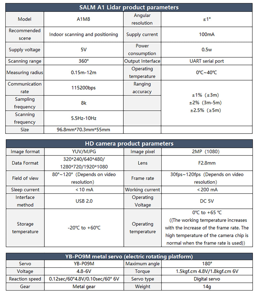 - Professional hardware configuration: SLAM lidar, HD camera/depth camera, powerful coding gear motor, metal servo, and Yaboom robot expansion board, etc.