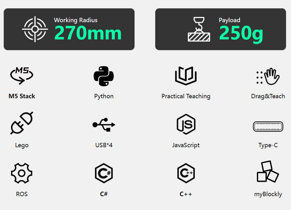 A4: mechArm 270: The net weight of mechArm is 1kg, the payload is 250g, and the working range is 270mm.